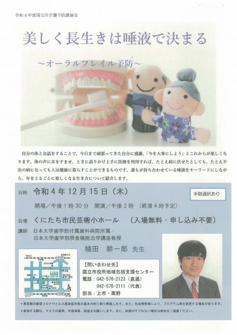 国立市歯科医師会は、現在実施している国立市の介護予防事業についてお話しいたします。ぜひ、ご参加ください。